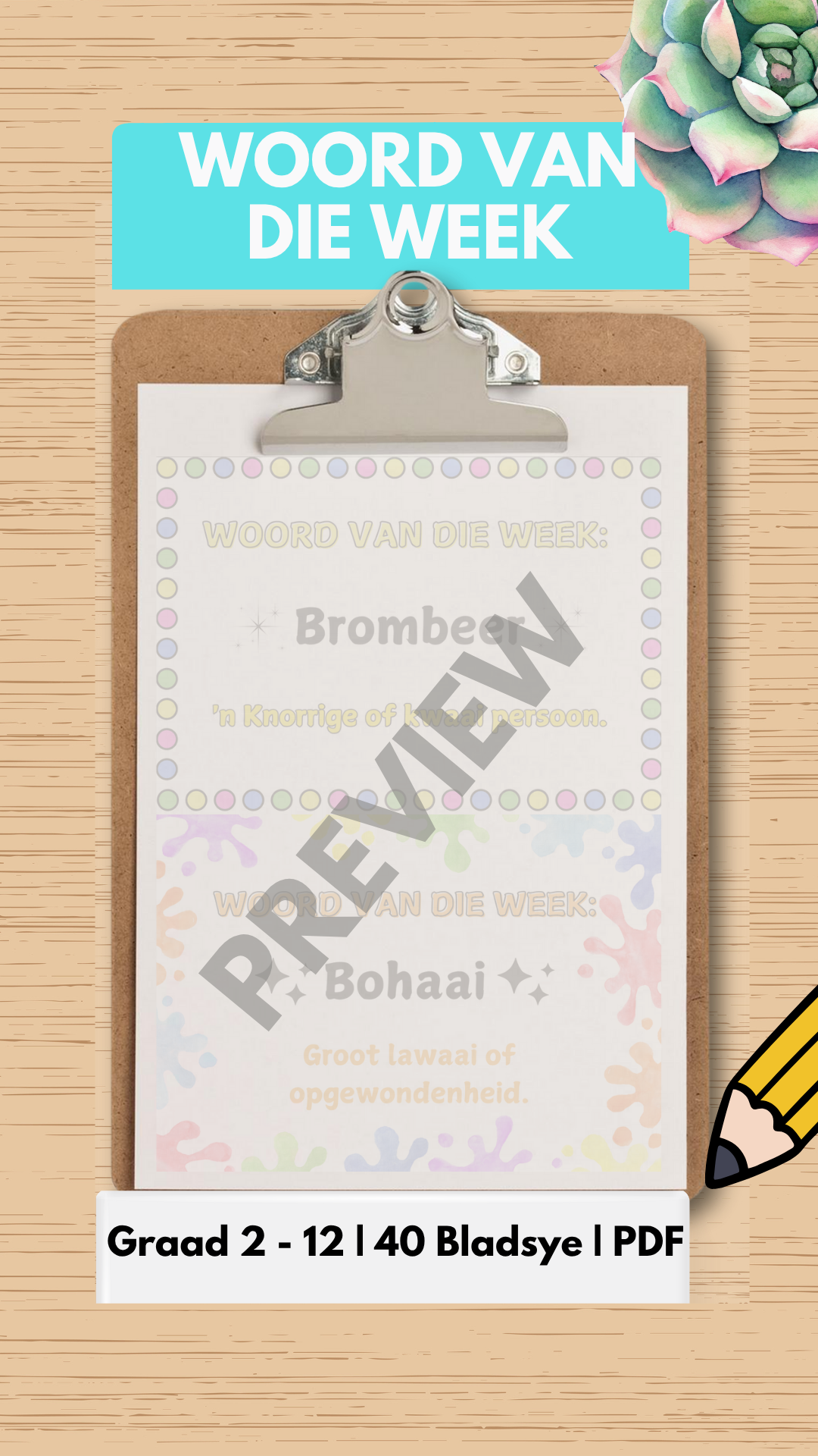 Ontdek die "Woord van die Week"-versameling, met 40 bladsye wat elk 'n nuwe woord saam met die betekenis daarvan uitlig. Hierdie hulpbron ondersteun woordeskatgroei deur een woord op 'n slag bekend te stel, wat leer hanteerbaar maak en konsekwente vordering aanmoedig. Perfek vir studente, opvoeders of enigiemand wat gretig is om hul taalvaardighede op 'n ondersteunende en boeiende manier uit te brei.